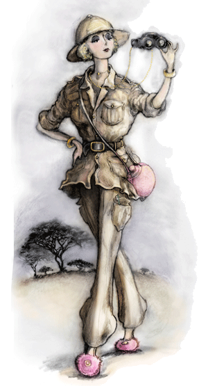 Left: Costume design sketch for the 1935 screwball comedy Elephant Trouble! showing the lead actress in Safari Pajamas. The khaki-colored rayon satin sleepwear was a huge hit with the American public until an unfortunate incident at a movie premiere. Illustration by an anonymous movie studio staff artist. Watercolor. 1934. |